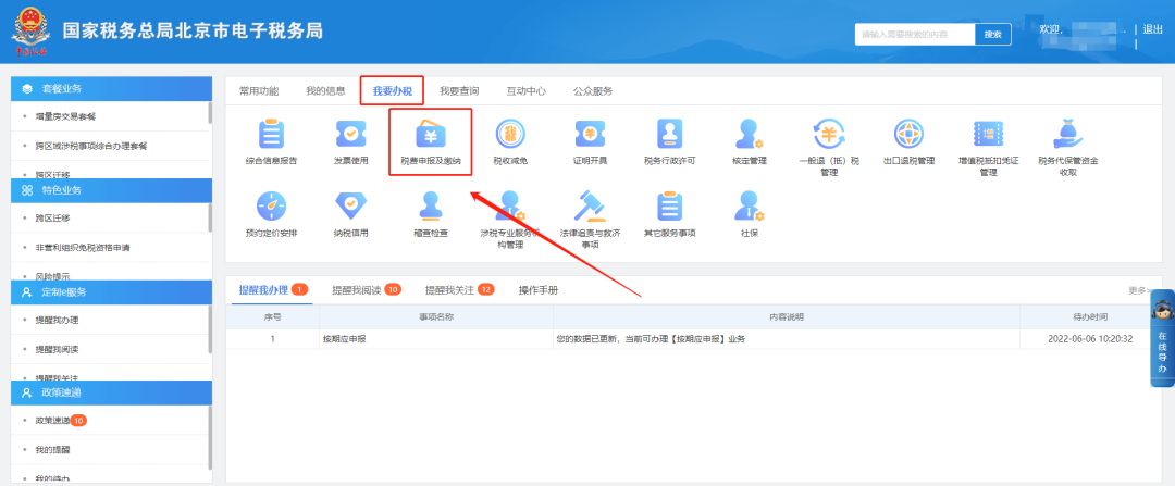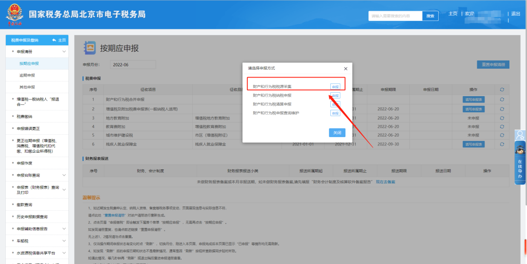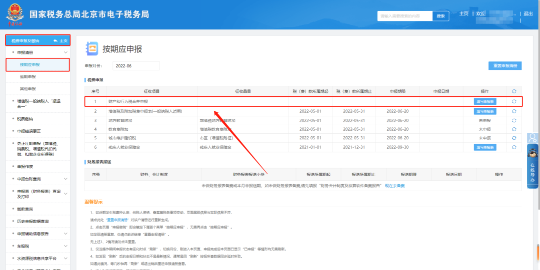 二、税费申报及缴纳—按期应申报—财产和行为税合并申报。