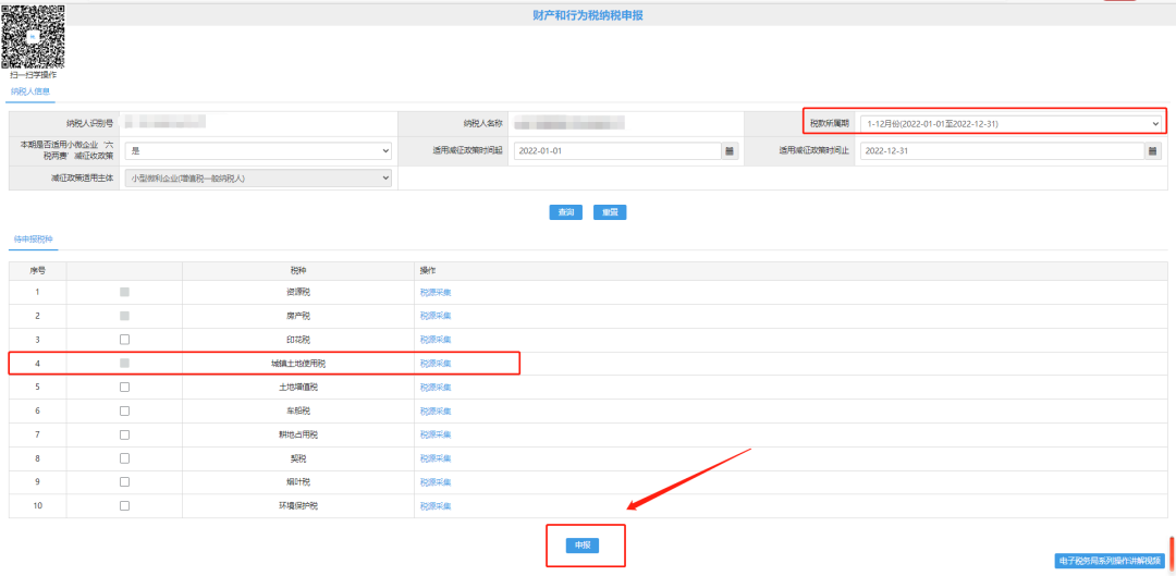 六、在界面上方选择税款所属期,勾选城镇土地使用税,点击申报。