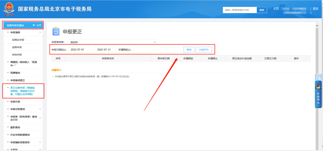 二、税费申报及缴纳—更正往期申报(增值税、消费税、增值税代扣代缴、扣缴企业所得税)页面。