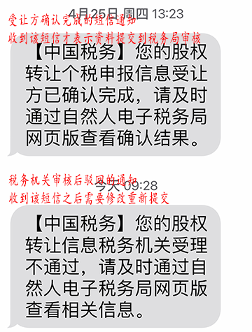 受让方确认成功之后,该次股权转让的资料才最终会提交到税务局,等待税务工作人员审核。工作人员会根据提交的资料决定驳回修改或者通过审核,并发送短信到转让方手机号码号码上。