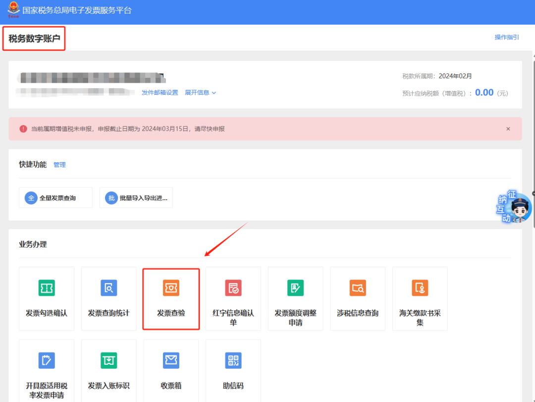 一、我要办税—税务数字账户。 二、税务数字账户—发票查验。 三、发票查验进入查询界面,选择“手工查验”并按实际情况填写相应项目,点击“查验”,系统会显示对应发票查验结果。 使用全国增值税发票查验平台。纳税人查询电子发票(增值税专用发票)、电子发票(普通发票)时需录入“发票号码(20位)、开票日期、价税合计”信息;查询电子发票服务平台开具的纸质增值税专用发票时需录入“发票代码、发票号码、开票日期和开具金额(不含税)”信息;查询电子发票服务平台开具的纸质增值税普通发票时需录入“发票代码、发票号码、开具日期和校验码(密码区发票号码后六位)”信息。